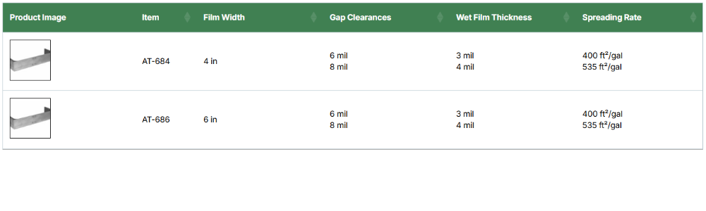 각 블레이드는 일반적으로 표면 너비(film width) 및 노치 높이 정보가 표시된 구조이며, 도포 시험에서 근사 도포율(spreading rate) 계산에도 활용 가능한 도구로 사용됨