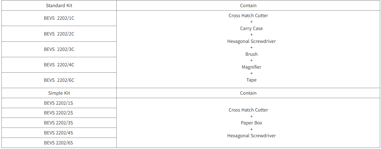 • BEVS 2202 Cross Hatch Cutter는 ISO 2409:1992, GB/T 9286-98, BS 3900 E6, ASTM D3359 규격에 따라 설계·제조된 수동식 크로스 해치 커터로,